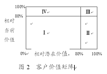 (二)確定客戶當(dāng)前相對價值和客戶相對潛在價值通過預(yù)測,識別出了客戶當(dāng)前價值CCV和增值潛力CPV。但是,這兩個維度指標(biāo),均以絕對價值形式出現(xiàn)對客戶進(jìn)行細(xì)分并不理想(張國方,金國棟,2003(3)),在一定程度上會影響到理論應(yīng)用的方便性(簡便性)。因此,可以采用更加明了和更具有實踐操作性的維度指標(biāo)——客戶當(dāng)前相對價值和客戶相對潛在價值!翱蛻舻南鄬Ξ(dāng)前價值”是指某一客戶提供的當(dāng)前價值與企業(yè)未來可望實現(xiàn)的當(dāng)前價值總額的比值;而“客戶的相對潛在價值”是某一客戶提供的增值價值與企業(yè)未來可望實現(xiàn)的全部最大增值價值的比值。