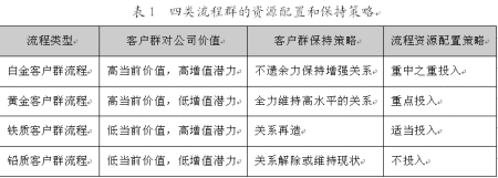 流程由活動、活動的邏輯順序、活動的實現(xiàn)方式、活動的承擔(dān)者四個基本要素組成。通過活動的整合來產(chǎn)生“流程多面手”或活動講廢除來減少成本,利用信息技術(shù)將“串聯(lián)”活動變成“并聯(lián)”活動來改變活動斬邏輯順序以提高流程效率,或者改變活動承擔(dān)者的數(shù)量或素質(zhì),這些都將導(dǎo)致流程群資源分配的變動。例如,銀行的業(yè)務(wù)流程設(shè)置:低價值客戶以電子設(shè)備的自助服務(wù)為主;中價值客戶以柜面服務(wù)為主;高價值客戶以大戶室一對一服務(wù)為主;設(shè)置專業(yè)化的理財中心,由客戶經(jīng)理全程代為辦理各項業(yè)務(wù),同時由高素質(zhì)的理財專家根據(jù)客戶的風(fēng)險收益偏好提供高質(zhì)量的理財產(chǎn)品等?梢,不同客戶其流程的資源配置差異較大。依據(jù)客戶群——流程矩陣,下表描述了四類流程群所對應(yīng)的四類客戶群的四種資源配置方式。
