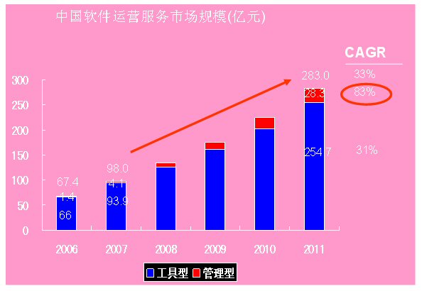 2006中國軟件運營服務(wù)(SaaS)產(chǎn)業(yè)的規(guī)模為68億元,2011年將突破400億,達到406億元,未來五年的復(fù)合增長率達到43%。這是國內(nèi)ICT領(lǐng)域權(quán)威研究機構(gòu)計世資訊(CCW Research)在其最新發(fā)布的《軟件業(yè)的下一個十年——中國軟件運營服務(wù)(SaaS)市場發(fā)展趨勢研究報告》中指出的。