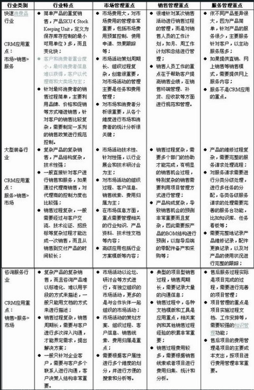 從以上簡單的分析過程我們可以看出由于企業(yè)所處行業(yè)特點的不同,導致在市場、銷售和服務(wù)方面對CRM主要功能需求差別非常大。企業(yè)在實際選型過程中,還需要對行業(yè)再進行細分分析,比如在快速消費品中,洗滌用品行業(yè)和牛奶乳業(yè)行業(yè)在客戶服務(wù)的主要需求等方面就有比較大的差別,這些都需要細致的分析。