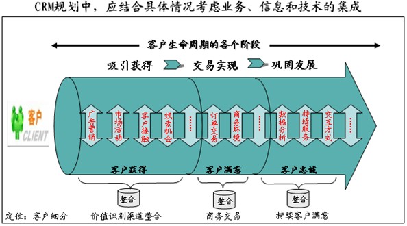 在客戶生命周期的全過程中,企業(yè)通過高效、有序的管理手段和信息技術,識別、吸引獲得、交易實現(xiàn)、鞏固發(fā)展客戶,與其保持終身的互動關系,并有計劃地滿足其需求。整個過程中有一橫N縱,一橫就是客戶生命周期線,N縱就是企業(yè)與客戶生命周期線的每個直接或間接接觸點。通過這一橫N縱,打造以客戶為中心的360度客戶服務。有的接觸點貫穿客戶整個生命周期。