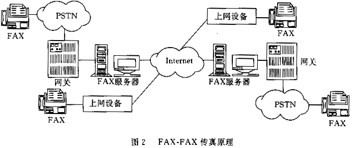 發(fā)送端傳真機(jī)與網(wǎng)關(guān)連接,通過PSTN傳送傳真,網(wǎng)關(guān)接收傳真后通過Internet傳至另一端的網(wǎng)關(guān),另一端的網(wǎng)關(guān)再通過PSTN將傳真發(fā)送給接收端傳真機(jī)。這種方式既適合存儲(chǔ)轉(zhuǎn)發(fā)模式,也適合實(shí)時(shí)模式,因此更加有吸引力。近年來,出現(xiàn)了一種不依賴網(wǎng)關(guān)的FAX-FAX IP傳真技術(shù),它是利用傳真機(jī)外掛一專用上網(wǎng)設(shè)備直接在Internet網(wǎng)上發(fā)送信息,原理如圖2所示。
