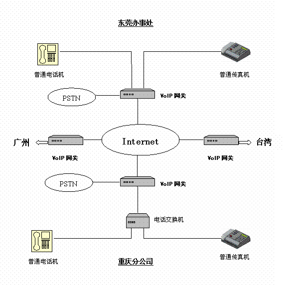 有一家臺商公司,在臺灣、東莞、廣州和重慶自己的分支機構,相互之間有大量的通話聯系,特別是研發(fā)部門,其通話量更是非常大。因此試圖在各個地方之間使用IP電話來降低通訊支出。在實施IP電話服務之前,各個地方都擁有完善的局域網,并且申請了固定IP的寬帶接入。并且在辦公室內部署了程控電話交換機。