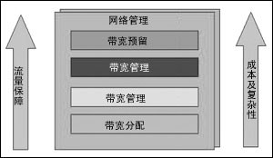 如圖所示,網(wǎng)絡管理貫穿于四個模塊建立過程中。特定的組件應針對網(wǎng)絡基礎設施的特定部分而實施。具體實施時,應首先從帶寬分配模塊開始,然后逐個上移。實施的模塊越多,保證的品質會越高,但同時也增加了管理的復雜性,加大了維護成本。