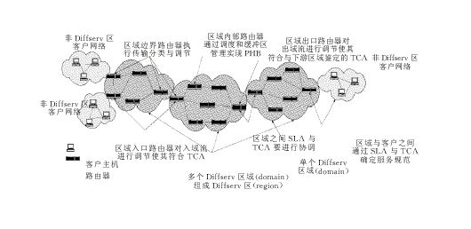 區(qū)分服務(wù)是由綜合服務(wù)(Int-serv )發(fā)展而來的,它采用了IETF的基于RSVP的服務(wù)分類標準,拋棄了分組流沿路節(jié)點上的資源預(yù)留。區(qū)分服務(wù)將會有效地取代跨越大范圍的RSVP的使用。區(qū)分服務(wù)區(qū)域的主要成員有:核心路由器、邊緣路由器、資源控制器(BB,Bandwidth Broker)。在區(qū)分服務(wù)中,網(wǎng)絡(luò)的邊緣設(shè)備對每個分組進行分類、標記DS域,用DS域來攜帶IP分組對服務(wù)的需求信息。在網(wǎng)絡(luò)的核心節(jié)點上,路由器根據(jù)分組頭上的DS碼點(Code Point)選擇碼點所對應(yīng)的轉(zhuǎn)發(fā)處理。資源控制器BB配置了管理規(guī)則,為客戶分配資源,它可以通過服務(wù)級別協(xié)定SLA (Service Level Agreement)與客戶進行相互協(xié)調(diào)以分享規(guī)定的帶寬。