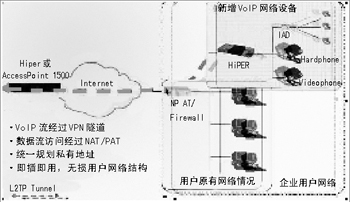 眾所周知,得到了廣泛的商用VoIP協(xié)議之一H.323功能強大,能根據網絡的狀況協(xié)商VoIP網關參數。但是,H.323協(xié)議的編碼的復雜性和端口的不確定性使得絕大部分NAT/PAT設備不能處理H.323。然而,基于HiPER的L2TP的VPN解決方案,不僅使話音在一個安全的網絡中運行,還可以解決由于H.323協(xié)議復雜性帶來的NAT/PAT問題,在不用改造用戶現有的數據網絡的前提下,引進了可以實際使用的VoIP服務,保護了用戶的投資。