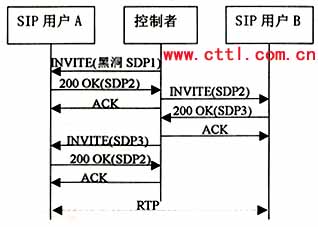 該流程中,控制者首先向用戶A發(fā)送INVITE,包含SDP1,用來創(chuàng)建一個初始的“黑洞”媒體流,A振鈴并產(chǎn)生應(yīng)答記為SDP2,其中包含的是一個有效的連接地址,但此時仍沒有媒體流向控制者?刂普呦駻發(fā)出ACK。
