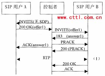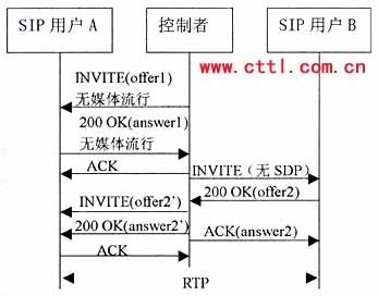 控制者再向B發(fā)送一個沒有SDP的INVITE。B應(yīng)答的200 0K響應(yīng)中包含一個提供offer2,控制者應(yīng)該基于offer2向A發(fā)送一個re-INVITE,注意。offer2可能需要稍作修改來滿足媒體要求。例如如果offer1包含一個音頻和一個視頻行,而offer2只有一個音頻行,控制者就需要在offer2中增加一個視頻行(端口設(shè)為O)來構(gòu)成offer2’。由于這是一個re-INVITE,所以通常應(yīng)該能立即收到響應(yīng)。A的200