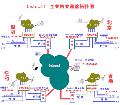 下面是集團用戶利用HeadCall的語音網(wǎng)關的通訊拓樸圖: