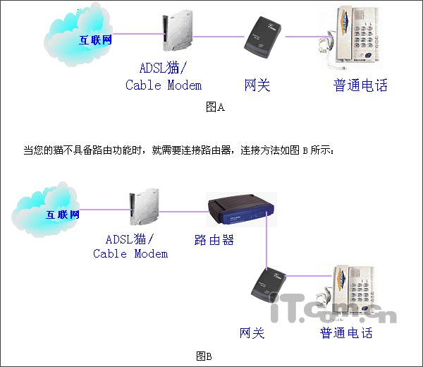 網(wǎng)關(guān)聯(lián)接至RJ45網(wǎng)線,普通電話機聯(lián)接在PHONE端口,該網(wǎng)關(guān)可通過市話線路或網(wǎng)絡(luò)撥打電話,原有市話線聯(lián)接在PSTN口上,直撥號碼時為通過網(wǎng)絡(luò)撥打,加前置碼#0*通過原有市話線撥打,如停電,所有電話均自動從原有市話線路撥出。