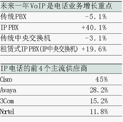 事實上,北美市場的實際銷售量已經(jīng)表明,市場中的傳統(tǒng)語音交換機銷售量已經(jīng)在明顯下降,而具備IP功能或純IP系統(tǒng)的銷售量卻在穩(wěn)步上升。Gartner 預計,2005年在北美地區(qū)銷售的純IP系統(tǒng)總價值將高達9.03億美元,比2004年的6.86億美元上升32%。同時,傳統(tǒng)電路交換系統(tǒng)的銷售量將從2004年的14億美元下降至9.99億美元,下降的幅度是32%。而混合式系統(tǒng)的銷量增長幅度可望達到30%,也就是說,從2004年的1.5億美元增長到2005年的2億美元。