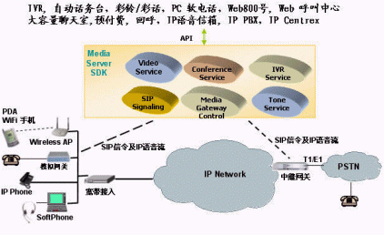 該公司的IP媒體服務(wù)器 (IP Media Server SDK)是一個(gè)具有IP多媒體處理能力和SIP呼叫功能的開放平臺(tái)。它主要提供給各增值業(yè)務(wù)開發(fā)商、軟交換廠商、軟件開發(fā)商以及具有開發(fā)能力的系統(tǒng)集成商。基于該平臺(tái),這些廠商可以迅速地、低成本地開發(fā)出各種各樣的基于IP的增值業(yè)務(wù)如下圖所示: