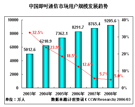 即時(shí)通訊巨大的市場(chǎng)價(jià)值主要來自三方面,除了能夠增加門戶網(wǎng)站的用戶的黏性,即時(shí)通訊能夠帶來巨大的用戶和網(wǎng)絡(luò)通訊巨大的市場(chǎng)。根據(jù)計(jì)世資訊《2005-2006年中國(guó)VoIP業(yè)務(wù)發(fā)展趨勢(shì)研究報(bào)告》相關(guān)數(shù)據(jù)顯示,2005年中國(guó)即時(shí)通訊用戶達(dá)到7362.1萬人,增長(zhǎng)率為18.5%,2005年中國(guó)即時(shí)通訊市場(chǎng)規(guī)模達(dá)到16.2億元,實(shí)現(xiàn)37.3%的增長(zhǎng)率。