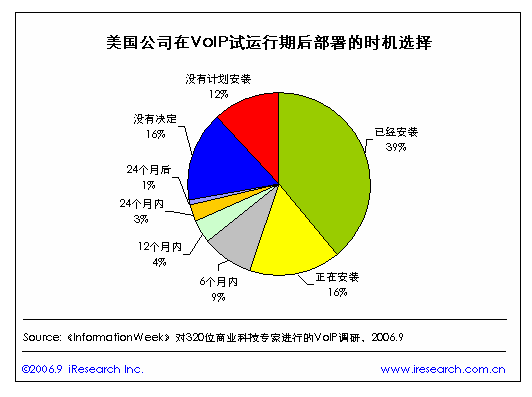 iResearch艾瑞市場咨詢整理《InformationWeek》對320位商業(yè)科技專家進(jìn)行的VoIP調(diào)研數(shù)據(jù)顯示,美國有近四成的公司在VoIP試運(yùn)行期后安裝了VoIP,正在安裝的也達(dá)到了一成以上,打算在6個月以內(nèi)安裝的有近一成。
