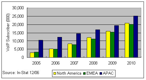 應(yīng)該說在2006年,VoIP技術(shù)已經(jīng)不是阻礙其市場發(fā)展的主要因素,因?yàn)镮n-Stat在全球個(gè)人VoIP消費(fèi)市場中作的調(diào)查顯示,約9%的VoIP用戶甚至不清楚自己在使用IP傳輸;有64%的用戶在使用免費(fèi)的VoIP服務(wù)。其次有超過73%的用戶并不把是否使用IP技術(shù)當(dāng)成選擇該業(yè)務(wù)的影響因素。而寬帶接入市場的競爭則構(gòu)成了VoIP發(fā)展的關(guān)鍵因素,作為一種寬帶應(yīng)用,誰的接入資源占據(jù)了用戶家庭,誰就可以決定是否采用VoIP技術(shù)來提供語音業(yè)務(wù)。在歐洲法國Free Telecom與意大利的FastWeb都是三重播放業(yè)務(wù)的積極推進(jìn)者,在VoIP市場居領(lǐng)先地位;在日本Yahoo!BB擁有亞洲地區(qū)50%的寬帶VoIP用戶。幾乎所有這些寬帶ISP提供商往往采用包月的形式或者以極低的費(fèi)用提供無限制的本地或國內(nèi)通話,在國際長途電話上提供極大的折扣。