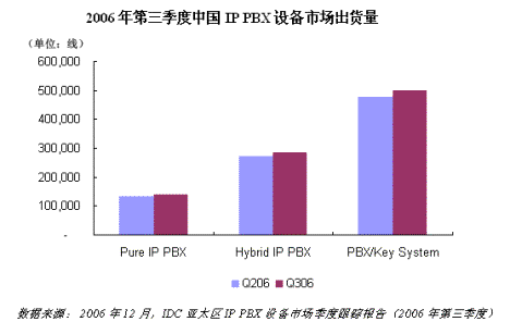 根據(jù)《IDC亞太區(qū)IP PBX市場季度跟蹤報(bào)告(2006年第三季度)》中國部分?jǐn)?shù)據(jù)顯示,2006年第三季度中國PBX系統(tǒng)出貨量接近100萬線,其中純IP PBX占到15.1%,混合PBX占到30.9%,傳統(tǒng)PBX占到54%。