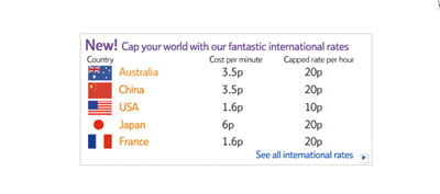套餐2(BusinessBroadbandVoiceLine Olny):免費(fèi)接入(通常需要40英鎊),每月5英鎊,本地及國(guó)內(nèi)通話資費(fèi)3.5便士/分鐘,第一個(gè)小時(shí)通話資費(fèi)10便士封頂;撥打手機(jī)通話優(yōu)惠,1小時(shí)通話資費(fèi)封頂25便士;國(guó)際通話優(yōu)惠,不同流向國(guó)家的1小時(shí)通話資費(fèi)封頂10或20便士,如圖3所示。