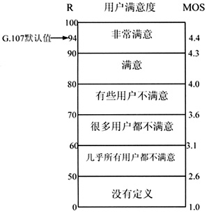 在ITU-T P.800中規(guī)定的平均主觀值MOS,基于該主觀評測把人接聽和感知語音質(zhì)量的行為被調(diào)研和量化,接聽到何種級別質(zhì)量的語音,就得到多少平均主觀值MOS。一般情況下MOS值是4或更高被認(rèn)為是比較好的語音質(zhì)量,而若平均主觀值MOS低于3.6,則大部分接聽者不能滿意語音質(zhì)量。平均主觀測試雖然準(zhǔn)確有效,但是這種方法存在的最大問題就是實(shí)現(xiàn)起來非常麻煩和昂貴,因此人們在不斷地探索能進(jìn)行客觀測量的方法。ITU-T的G.107標(biāo)準(zhǔn)提出的E模型考慮了延時(shí)、噪聲、回音、編碼器性能、丟包、抖動(dòng)等網(wǎng)絡(luò)損傷因素對語音質(zhì)量的影響。它的評價(jià)標(biāo)準(zhǔn)如圖1所示。