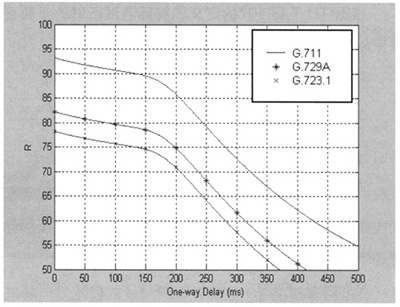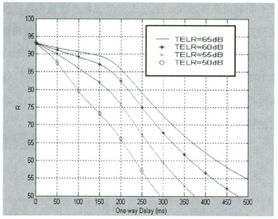 Datagram Protocol)協(xié)議進(jìn)行傳輸[1]。近年來,隨著IP網(wǎng)絡(luò)技術(shù)的廣泛應(yīng)用,VoIP成為一種新興的電話通信方式,IP網(wǎng)絡(luò)所提供的語音質(zhì)量問題受到人們的普遍關(guān)注,如何對語音質(zhì)量進(jìn)行科學(xué)可靠的測量和評價(jià)是網(wǎng)絡(luò)測量和網(wǎng)絡(luò)規(guī)劃設(shè)計(jì)中十分關(guān)鍵的問題。E-Model作為語音質(zhì)量測量的一種新方法,它適合數(shù)據(jù)網(wǎng)絡(luò)的語音質(zhì)量測量,必將有廣泛的應(yīng)用。本文將在E模型下分析延時(shí)、噪聲、回音和語音壓縮等對VoIP語音質(zhì)量的影響。