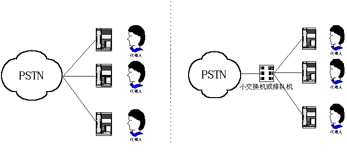 呼叫中心,早期是指一個由兩人或更多人組成的、在一個特定地方用專用設(shè)備處理電話業(yè)務(wù)的小組。這些人就是通常所說的呼叫中心代理(人)。一個呼叫中心可以只提供信息接收服務(wù),或者只提供信息發(fā)送服務(wù),或者是一個混合式呼叫中心,其呼叫中心代理會負(fù)責(zé)所有這兩項(xiàng)工作。從物理設(shè)備構(gòu)成來看,第一代呼叫中心可用下圖(1)、(2)表示。