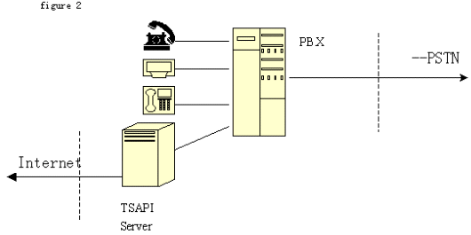 2、TSAPI技術(shù)標準:由Novell公司開發(fā)。它將程控交換機或中央電話系統(tǒng)與Netware網(wǎng)絡集成在一起?梢詫崿F(xiàn)呼叫轉(zhuǎn)移,交互式語音(IVR)和自動呼叫分配(ACD)等功能。支持包括Windows各種版本、OS/2和Unix等目前主要操作系統(tǒng)。不同于TAPI ,TSAPI在計算機和桌面之間建立一個邏輯的連接,通過這些連接在任一端的TSAPI應用就可以完成呼叫控制。由于TSAPI主要為Netware網(wǎng)操作系統(tǒng)增加電話服務,不在每個電話和PC之間建立直接的連接,而是由一個電話服務器Netware可加載模塊(NLM)、一個電話服務器API(TSAPI)、一個電話服務器庫和一個電話客戶庫組組成在服務器電話系統(tǒng)間建立的連接,因此這個連接也稱為PBX-To-Server連接。電話服務器 NLM是負責 PBX和 Netware服務器間傳送信息的。電話服務器 API是為運行于服務器上的應用提供電話服務器API。三方連接在客戶--服務器組網(wǎng)中比單方連接有更大的靈活性。網(wǎng)上的每個用戶都可迅速地通過現(xiàn)有的LAN基礎(chǔ)結(jié)構(gòu)撥入PBX。對其他服務的接入,如主機或終端仿真、傳真、E-mail等,都可以通過CTI接口獲得,只要這些業(yè)務已經(jīng)存在于網(wǎng)上。結(jié)構(gòu)如圖: