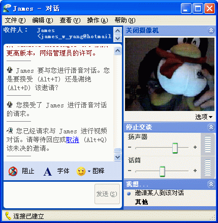 單擊對話框右邊的“啟動(dòng)攝像機(jī)”和“開始交談”,系統(tǒng)會(huì)提示你正在等待對方回應(yīng)視頻或語音對話的邀請,對方接受,就開始進(jìn)行視頻通話(見圖11)。如果雙方都有攝像頭,你還可以通過視頻框下面的“選項(xiàng)”將自己的影像設(shè)為畫中畫的功能。