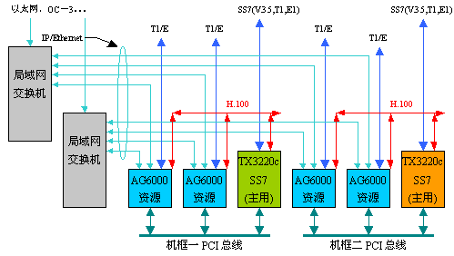 結(jié)構(gòu)圖中表示有兩臺(tái)機(jī)器,每臺(tái)機(jī)器都插有兩塊AG6000資源卡和一塊TX3220c卡。一臺(tái)機(jī)器是主用的,而另一臺(tái)是冗余備份的。AG6000完成媒體網(wǎng)關(guān)的功能,TX3220c完成信令網(wǎng)關(guān)的功能,媒體網(wǎng)關(guān)控制器是軟件實(shí)現(xiàn)的,沒有對(duì)應(yīng)的硬件。
