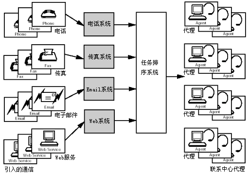 利用跨媒體排序,負載流的控制在唯一的一個中央負載排序系統(tǒng)中完成。電話系統(tǒng)將呼叫反饋給排序系統(tǒng);email系統(tǒng)發(fā)送email到排序系統(tǒng);Web服務(wù)器傳送消息給排序系統(tǒng),所有其他的通信媒體也以同樣的方式處理。這種統(tǒng)一的負載排序系統(tǒng)決定了下一個服務(wù)對象,以及通知不同的通信系統(tǒng)何時給客戶服務(wù)代理提交各自的通信信息。因此對任意發(fā)送源,負載流可順序到達。參見圖2。
