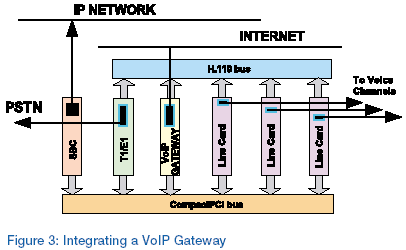 其它新業(yè)務(wù),例如IP話音(VoIP),如果要達到理想的性能,就需要電信系統(tǒng)內(nèi)部的集成,增加一塊網(wǎng)關(guān)板卡,作為附屬在CompactPCI總線和H.110總線上的外圍設(shè)備,F(xiàn)在,有了額外硬件(網(wǎng)關(guān)板卡)和VoIP的額外軟件,充分利用VoIP性能就成為可能(圖3)。