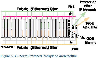 圖6的設(shè)置表明,在一個集成的分組交換底板解決方案中,這種最開始基于幾種不同機箱而開發(fā)的解決方案可能看起來象什么。建立在CompactPCI