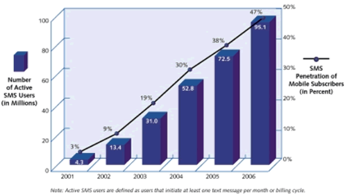 SMS在美國(guó)的使用落后于歐洲和日本, 但是工業(yè)分析是預(yù)測(cè)它會(huì)很快地趕上來. 請(qǐng)見圖1. 活躍的SMS用戶預(yù)計(jì)會(huì)從2002年的9%增加到2006年的47%.