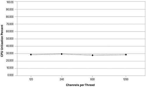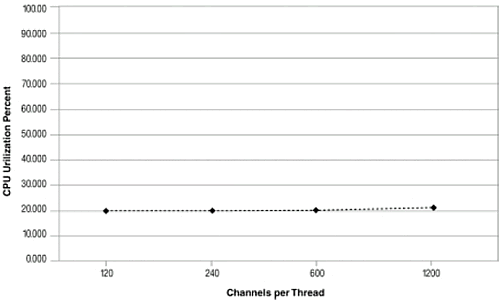 擴(kuò)展異步模式使用了36%到28%. 系統(tǒng)顯示了很高的擴(kuò)展性, CPU使用率和通道數(shù)成線形增長(zhǎng).
