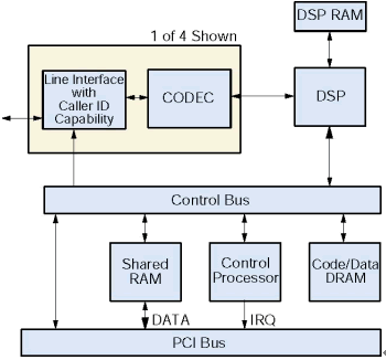 一個板卡上的微處理器控制D/4PCIU和D/4PCIUF通過一個本地總線控制板卡所有操作,它從主機截獲和執(zhí)行命令。這個微處理器處理實時的事件,管理和主機交互的數(shù)據(jù)流,提高系統(tǒng)的反應時間,減少主機處理的需求,傳遞給應用程序之前處理DTMF和電話信令,把DSP解脫出來專門做信令處理。這個微處理器和主機的通信是通過一個共享RAM,它作為一個輸入/輸出緩沖區(qū)增加的磁盤文件傳輸?shù)男。這個RAM和主機的接口是PCI總線。為了滿足實時系統(tǒng)的要求,所有操作的是中斷驅(qū)動的。所有安裝在PC里面的D/4PCIUF板卡共享同一個中斷。在系統(tǒng)初始化的時候,固件從主機下載到板卡上的代碼/數(shù)據(jù)