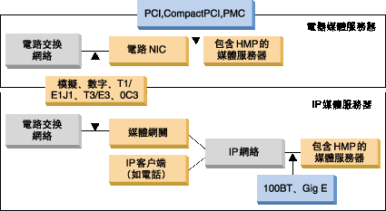 部署架構 模塊化的下一代網(wǎng)絡將語音和數(shù)據(jù)合并在單個包基礎結構中。這使目前的兩種主要架構可用于部署媒體服務;基于直通電路的網(wǎng)絡接口和基于包的IP網(wǎng)絡接口。下面的圖說明了這兩種架構。Dialogic