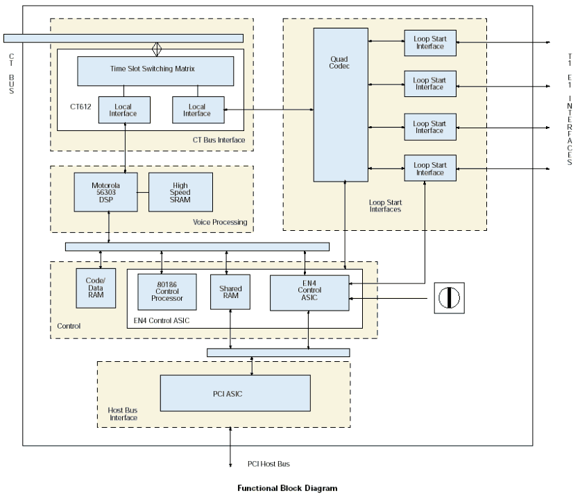 使用VFX/41JCT-LS板卡和CT總線時(shí),來自網(wǎng)絡(luò)板卡或其他資源的數(shù)字語音和資源通過H.100接頭和CT總線接口進(jìn)入板卡。由一個(gè)CT612芯片管理這些信號(hào),并且作為通道協(xié)調(diào)器和矩陣交換機(jī)來緩存來自總線的高速信號(hào)數(shù)據(jù),直到每個(gè)通道的數(shù)據(jù)發(fā)送到DSP。